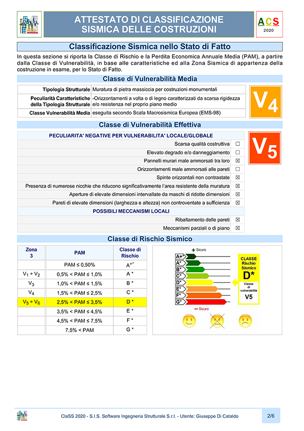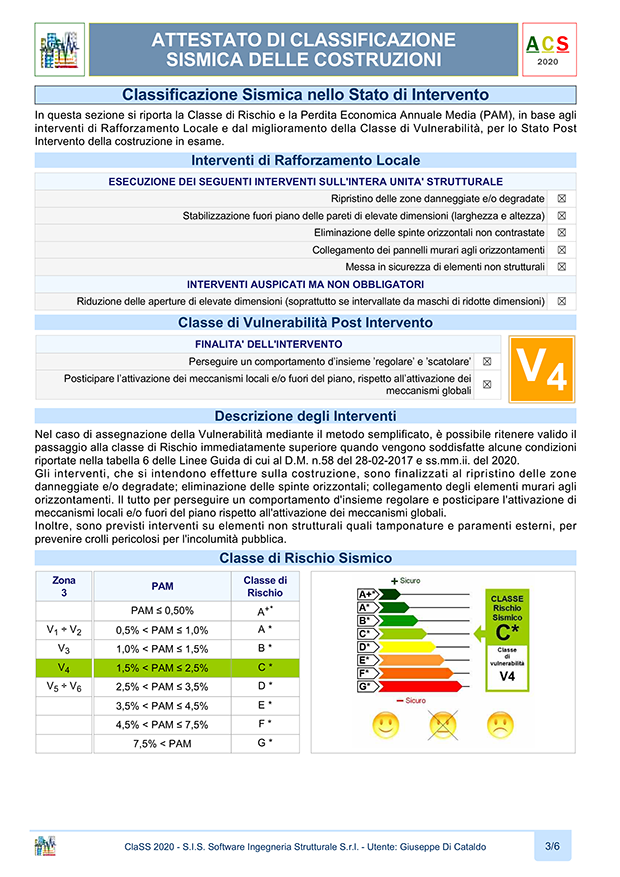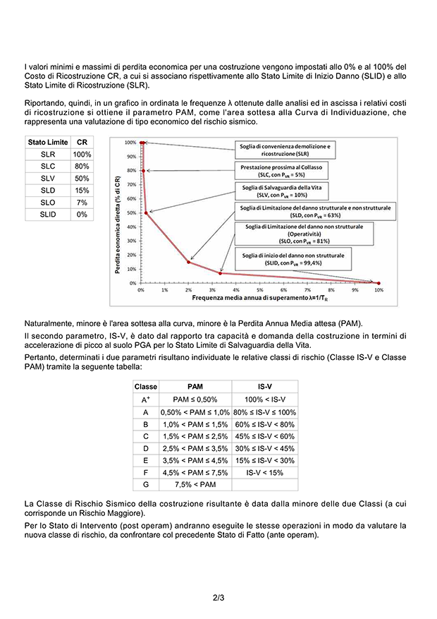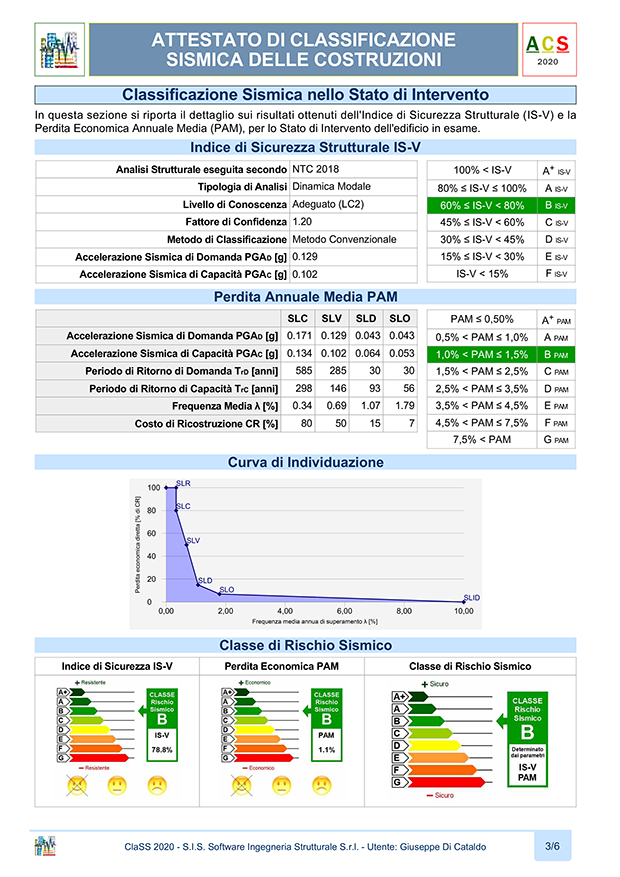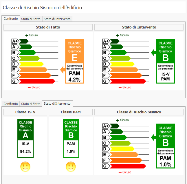 - Classificazione Sismica nello Stato di Fatto e di Intervento, sezione che contiene i risultati ottenuti e la Classe di Rischio Sismico della costruzione nello Stato di Fatto e nello Stato di Intervento. I risultati per le Classi IS-V e PAM vengono rappresentati con un diagramma colorato ed una freccia che indica la classe risultante ed il valore del parametro ottenuto in percentuale. Nella seconda parte della sezione, vengono riportati in dettaglio i dati di analisi ed i risultati ottenuti ponendo in evidenza la Classe IS-V e la Classe PAM risultanti nonché la Curva di Individuazione relativa alle perdite economiche.