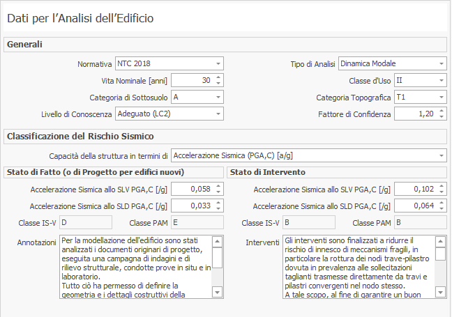 - Dati Generali, sezione contenente i dati identificativi della costruzione, la mappa che permette la localizzazione geografica ed i parametri per i riferimenti catastali e la localizzazione sismica. Nella seconda parte si riporta una panoramica sulla prestazione strutturale, confrontando la Classe di Rischio Sismico risultante per lo Stato di Fatto e quella relativa allo Stato di Intervento, se previsto.