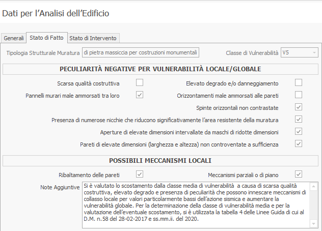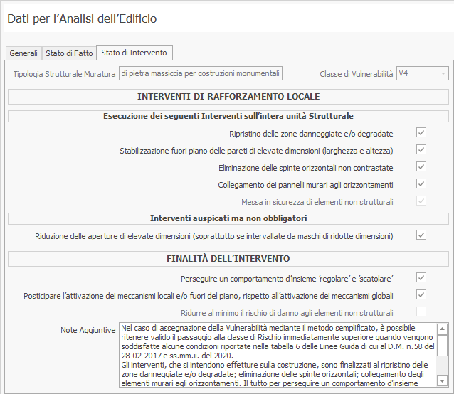 Per il Metodo Semplificato vengono dettagliatamente riportate le caratteristiche della costruzione per determinare la Classe di Vulnerabità per lo Stato di Fatto, secondo la Tab.4 delle Linee Guida. Per l'eventuale Stato di Intervento (Post operam) vengono riportati tutti gli interventi di rafforzamento strutturali previsti per il miglioramento della Classe secondo quanto stabilito dalla Tab.6 delle suindicate LL.GG.
