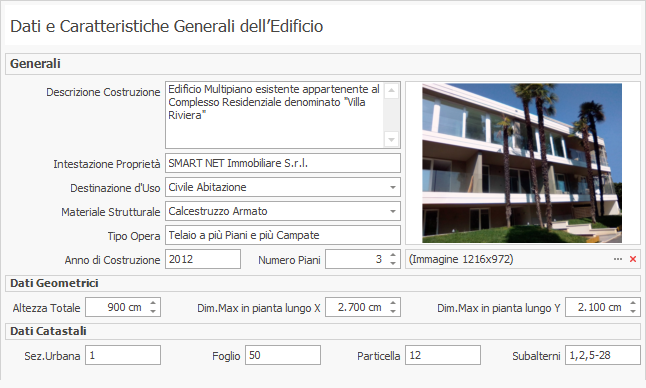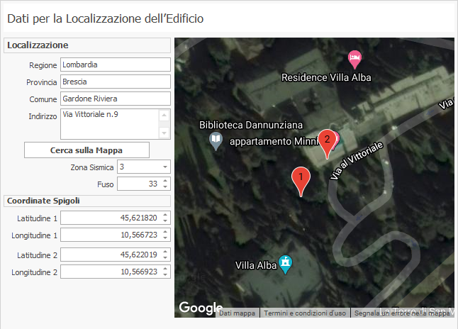 Tra i Dati dell'Edificio, oltre i dati catastali e le caratteristiche generali, viene determinata la localizzazione, tramite l'utilizzo di una mappa integrata con Google Maps, con le sue coordinate geografiche e con l'azione sismica attesa al sito.