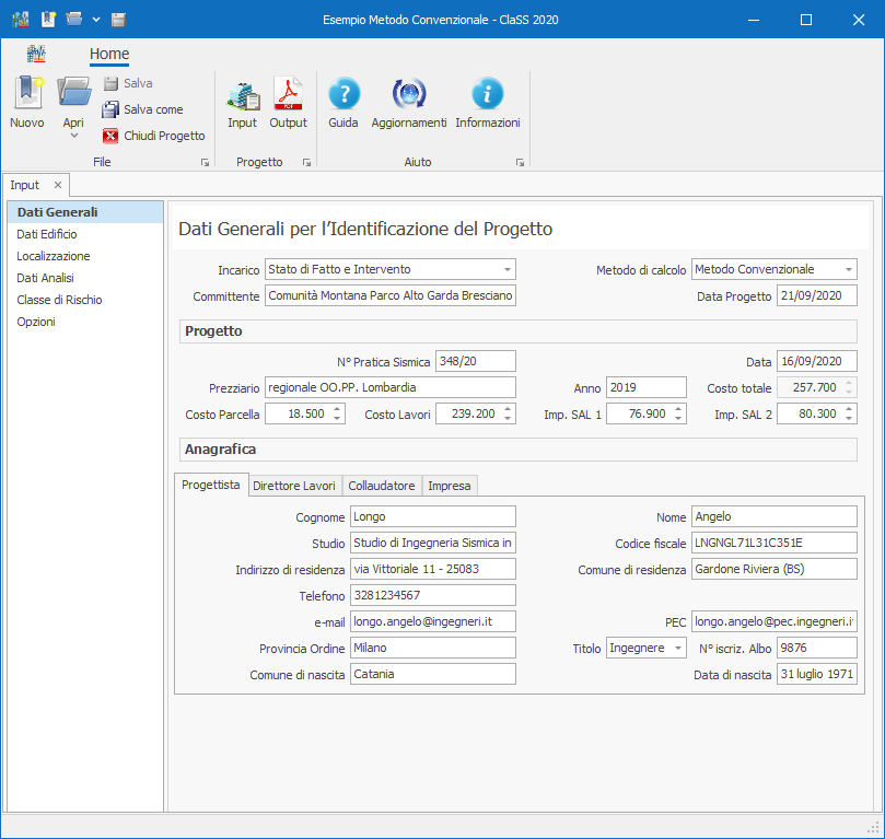 Per il Metodo Convenzionale, si determina la Classe di Rischio Sismico, con l'inserimento dei risultati dell'analisi strutturale della costruzione (ricavata da un software di calcolo strutturale indipendente dal software ClaSS), e la sua capacità espressa in termini di Accelerazione di Picco al suolo (PGA,C) o del Periodo di Ritorno (Tr,C), oppure della Percentuale dell'Accelerazione di Picco al suolo attesa al sito (PGA,D), che inducono al raggiungimento degli Stati Limite previsti dalle ultime Norme Tecniche per le Costruzioni.