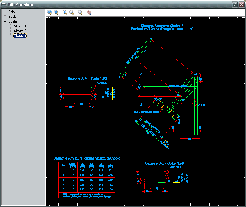 Per gli Sbalzi d'Angolo vengono riportate, oltre alle armature longitudinali, disposte a raggiera rispetto alla diagonale, anche quelle di ripartizione lungo i due lati dello Sbalzo. Per una esatta disposizione delle armature, inoltre viene riportato un dettaglio delle armature, con diametri, lunghezze parziali e totali e ulteriori indicazioni sull'ordine di disposizione. Vengono anche indicate le armature della Trave di contrappeso. Infine, in presenza di Ringhiera con parapetto in c.a., viene riportata la distinta delle armature di quest'ultimo.