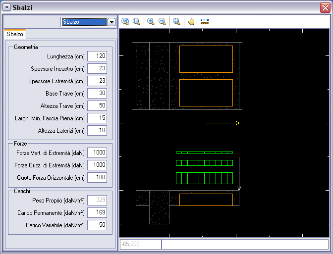Gli Sbalzi laterali vengono definiti mediante le caratteristiche geometriche proprie (Larghezza e Spessore) e della Trave in corrispondenza della sezione di incastro. E' possibile definire Sbalzi a spessore sia costante che variabile, e prevedere azioni concentrate all'estremità, sia orizzontali che verticali.