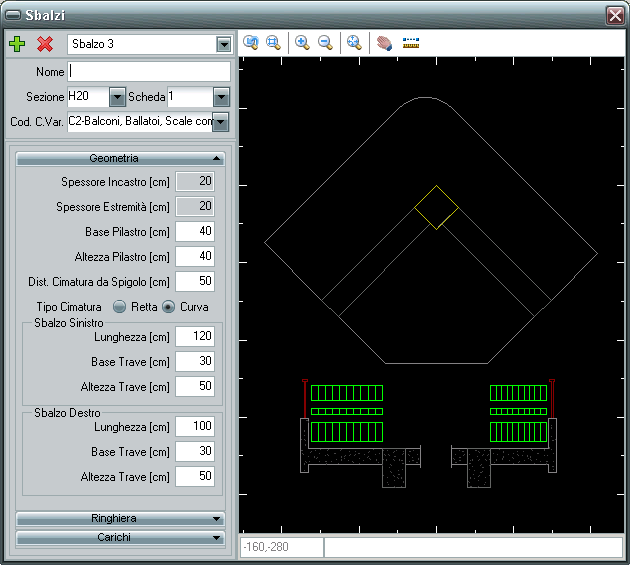 Gli Sbalzi d'angolo vengono definiti mediante le caratteristiche geometriche proprie, quali Larghezza sia a sinistra che a destra, Spessore all'incastro e all'estremità, tipo di Cimatura e Distanza dallo spigolo, nonché tutte le caratteristiche degli elementi strutturali di appoggio, quali dimensioni della sezione del Pilastro d'angolo e della Trave in corrispondenza della sezione di incastro. E' possibile definire Sbalzi a spessore sia costante che variabile, e prevedere azioni concentrate all'estremità, sia orizzontali che verticali.