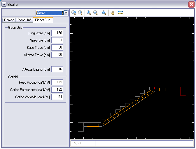 Le Scale vengono definite mediante le caratteristiche geometriche di Rampa, Pianerottolo Inferiore e Superiore e Carichi su di essi gravanti. Per la Rampa vanno definite: Larghezza, Lunghezza, Numero Pedate e Spessore Laterizi; mentre per i Pianerottoli vanno definite: Quota, Lunghezza e Spessore del Pianerottolo, Altezza Laterizi e Base e Altezza della Trave inferiore (per Pianerottolo inferiore) e superiore (per Pianerottolo superiore).