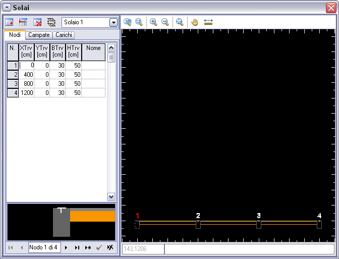 I Solai vengono definiti mediante le caratteristiche di Nodi, Campate e Carichi. I nodi di ogni Solaio, che identificano il punto medio superiore delle Travi su cui poggiano le campate, vengono identificati attraverso una coppia di coordinate cartesiane. Vengono riportate la Larghezza e l'Altezza della Trave inferiore, che risultano essere nulli nel caso di estremità di mensola a sbalzo.