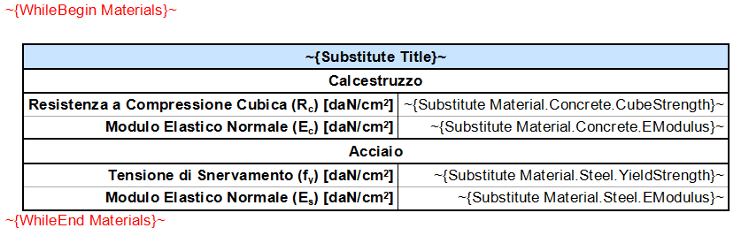 I dati di Output, elaborati dal programma per uno specifico progetto, sono contenuti in semplici istruzioni marcate con i simboli ~{ }~, di seguito descritte.