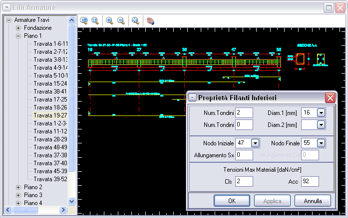 Dopo avere effettuato il progetto e la verifica degli elementi strutturali, è possibile visualizzare a video e modificare interattivamente le armature proposte dal programma, con verifica istantanea delle tensioni/deformazioni. Facendo semplicemente doppio clic sui ferri che si desidera modificare, si apriranno finestre interattive, contenenti le informazioni riguardo alla quantità dei ferri disposti, al diametro e ai nodi iniziale e finale.