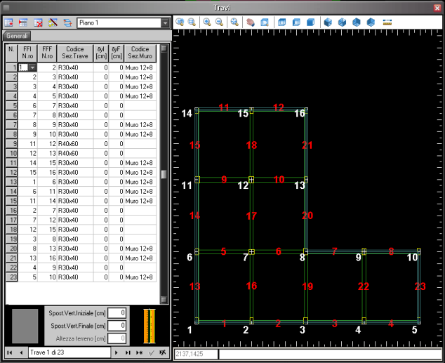 L’Input della struttura risulta immediato grazie alla definizione preliminare dei Fili Fissi dell’edificio. Si tratta di inserire, mediante opportune coordinate, dei punti che individuano la posizione dei vari elementi strutturali per tutti i piani dell’edificio. I Fili Fissi denotano così gli allineamenti che definiscono lo sviluppo in pianta e in elevazione dell’edificio, regolando la posizione dei Pilastri e le modalità di incidenza di tutte le Travi che afferiscono al Pilastro stesso. Per ogni Filo Fisso, inoltre, è possibile scegliere la quota iniziale di imposta oppure l’abbassamento in copertura della corrispondente Pilastrata.